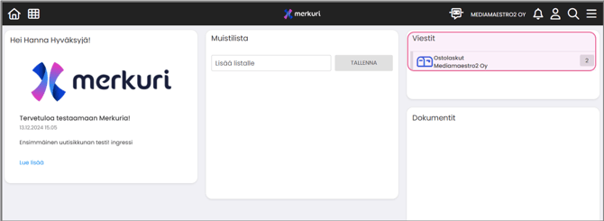 Merkurin etusivulle on mahdollista ottaa käyttöön Viestit-osio, jossa kerrotaan, kuinka monta laskua odottaa hyväksyntääsi.