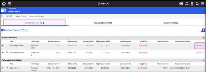 Hyväksyttävät laskut löydät KÄSITELTÄVÄT-välilehdeltä.