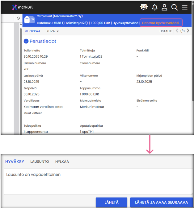- Linkistä pääset suoraan hyväksyttävälle ostolaskulle.