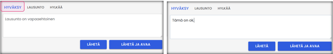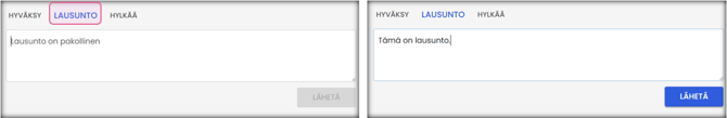 - Halutessasi voit kirjoittaa hyväksymismerkinnän. Jos lausunto on pakollinen hyväksymisen yhteydessä, kirjoita hyväksymismerkintä. Valitse: