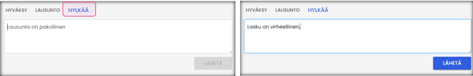- Jos et voi hyväksyä laskua, valitse HYLKÄÄ, lisää selitys ja paina LÄHETÄ
