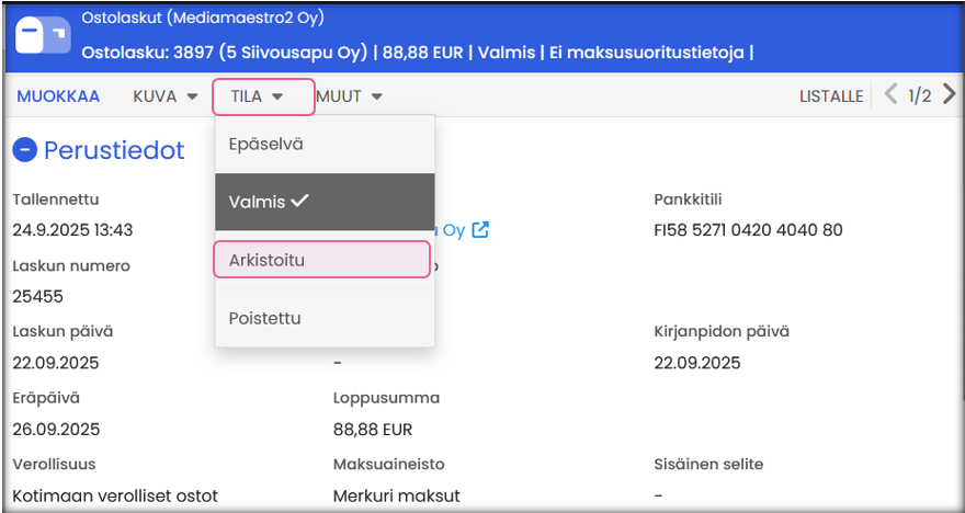 Avaa ostolasku ja valitse TILA → Arkistoitu