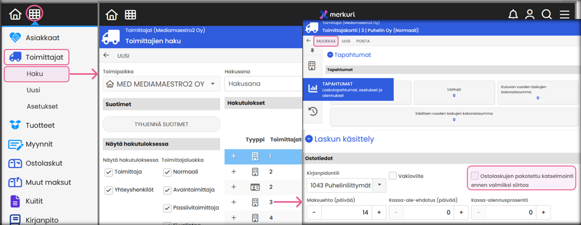 - Avaa toimittajakortti: Valitse Toimittajat → Haku → Avaa kortti