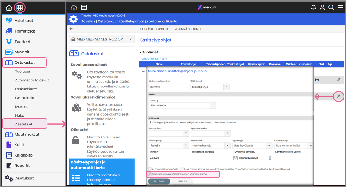 - Avaa käsittelypohja: Ostolaskut → Asetukset → Käsittelypohjat ja automaattikierto