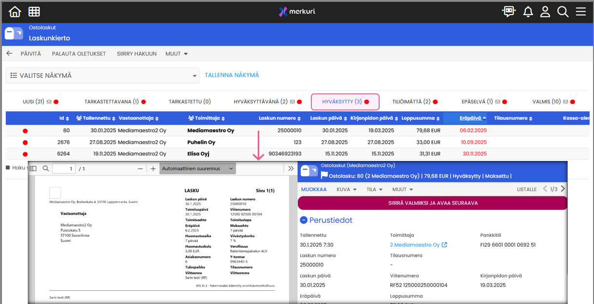 → Lasku siirtyy Valmis-tilaan ja seuraava lasku avautuu tarkastettavaksi