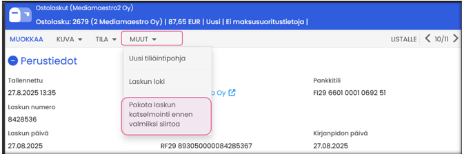 - Voit tarkastaa laskun tiedot ennen siirtoa kirjanpitoon