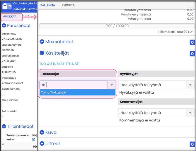 Lisää laskulle tarkastajat ja hyväksyjät