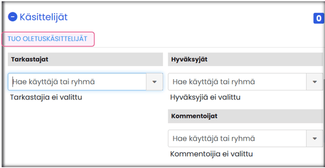 - Tuo oletuskäsittelijät -toiminnolla voit tuoda laskulle ne käsittelijät, jotka on määritelty ostolaskujen asetuksissa. Poista tarvittaessa laskulta ne käsittelijät, jotka eivät ole tarpeellisia kyseisellä laskulla.