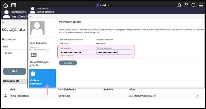 - Kaikki käyttäjät voivat vaihtaa oman salasanansa.