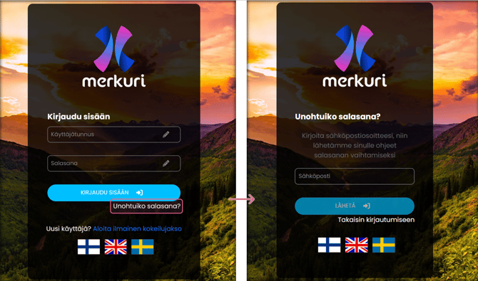 - Jos salasana on unohtunut, voit tilata uuden salasanan kirjautumisnäkymässä.