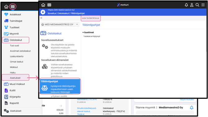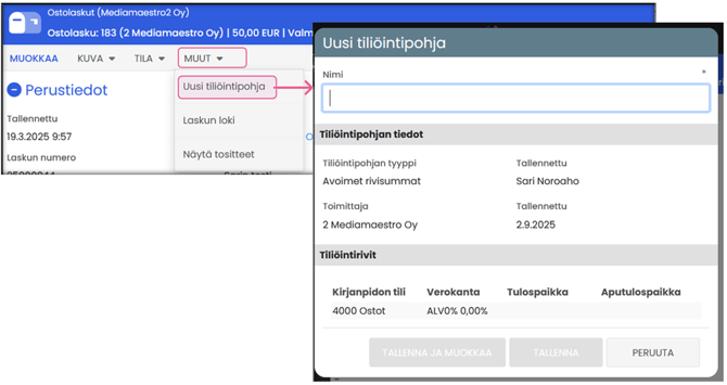 - Avaa Ostolaskut → Asetukset → Tiliöintipohjat
