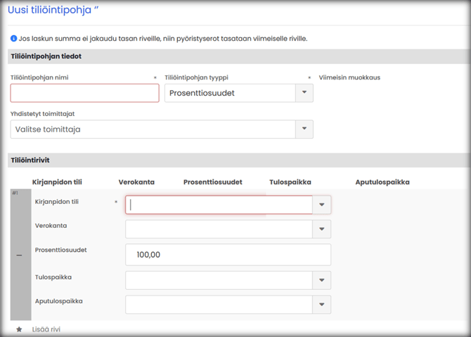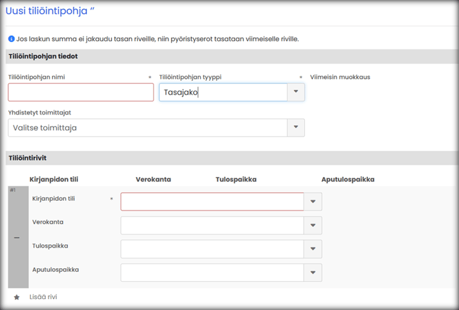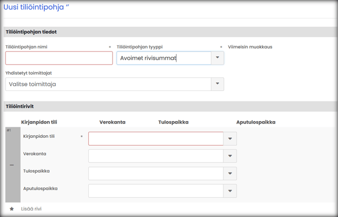 Ostolaskulta luotu tiliöintipohja tallentuu automaattisesti Avoimet rivisummat -tyyppiseksi. Tiliöintipohjan tyyppiä voi muuttaa ostolaskujen asetuksissa - Tiliöntipohjat.