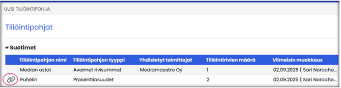 Jos tiliöintipohja on yhdistetty käsittelypohjaan, rivillä näkyy linkityskuvake 🔗.