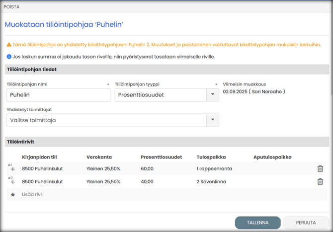 "Tämä tiliöintipohja on yhdistetty käsittelypohjaan ja muutokset vaikuttavat käsittelypohjan mukaisiin laskuihin."