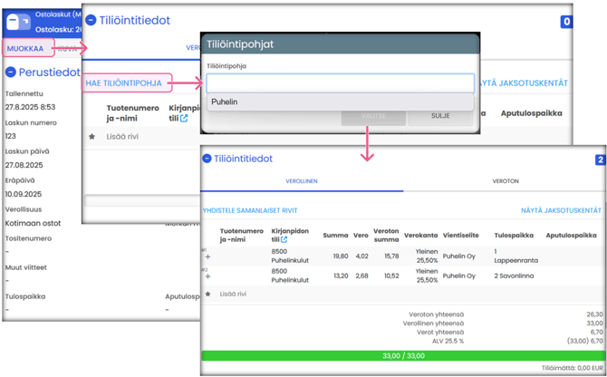 →Järjestelmä täyttää laskulle automaattisesti pohjan mukaiset tiliöintitiedot. Laskulle tuotuja tiliöintitietoja voi tarvittaessa muokata.