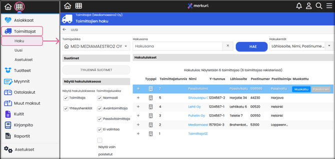 Hae toimittajia eri hakuehdoilla, kuten toimittajan nimen tai y-tunnuksen mukaan.