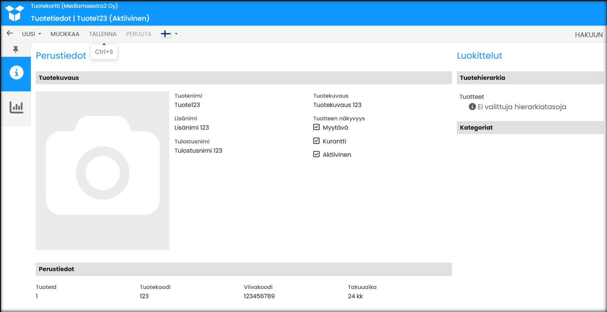 | TALLENNA | Tallentaa tehdyt muutokset tuotekortille. |