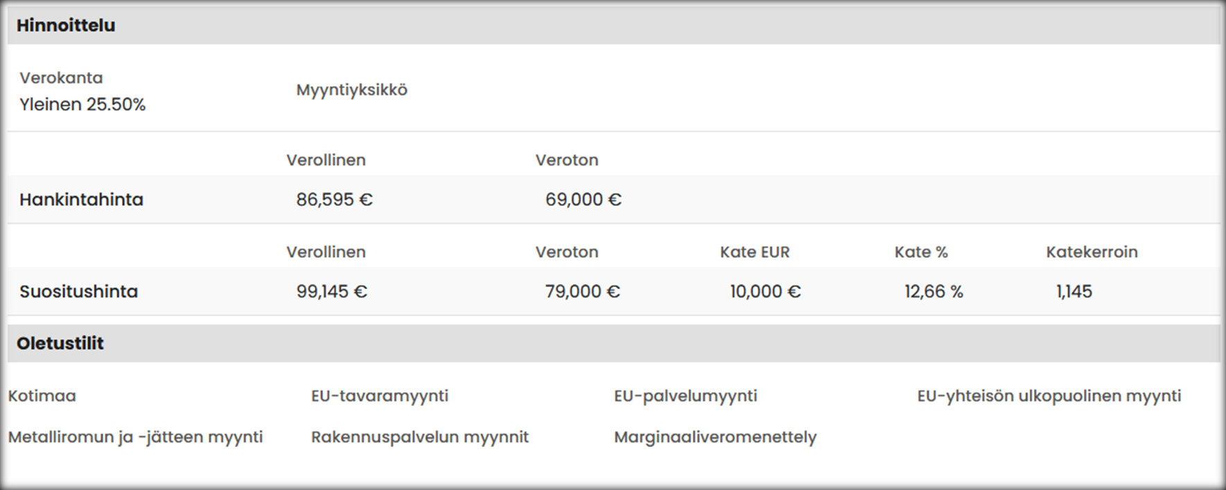 | Oletustilit | Määritä tuotekohtaiset kirjanpidon oletustilit. Jos kenttä on tyhjä, käytetään myyntien asetuksissa määriteltyjä tilejä. |