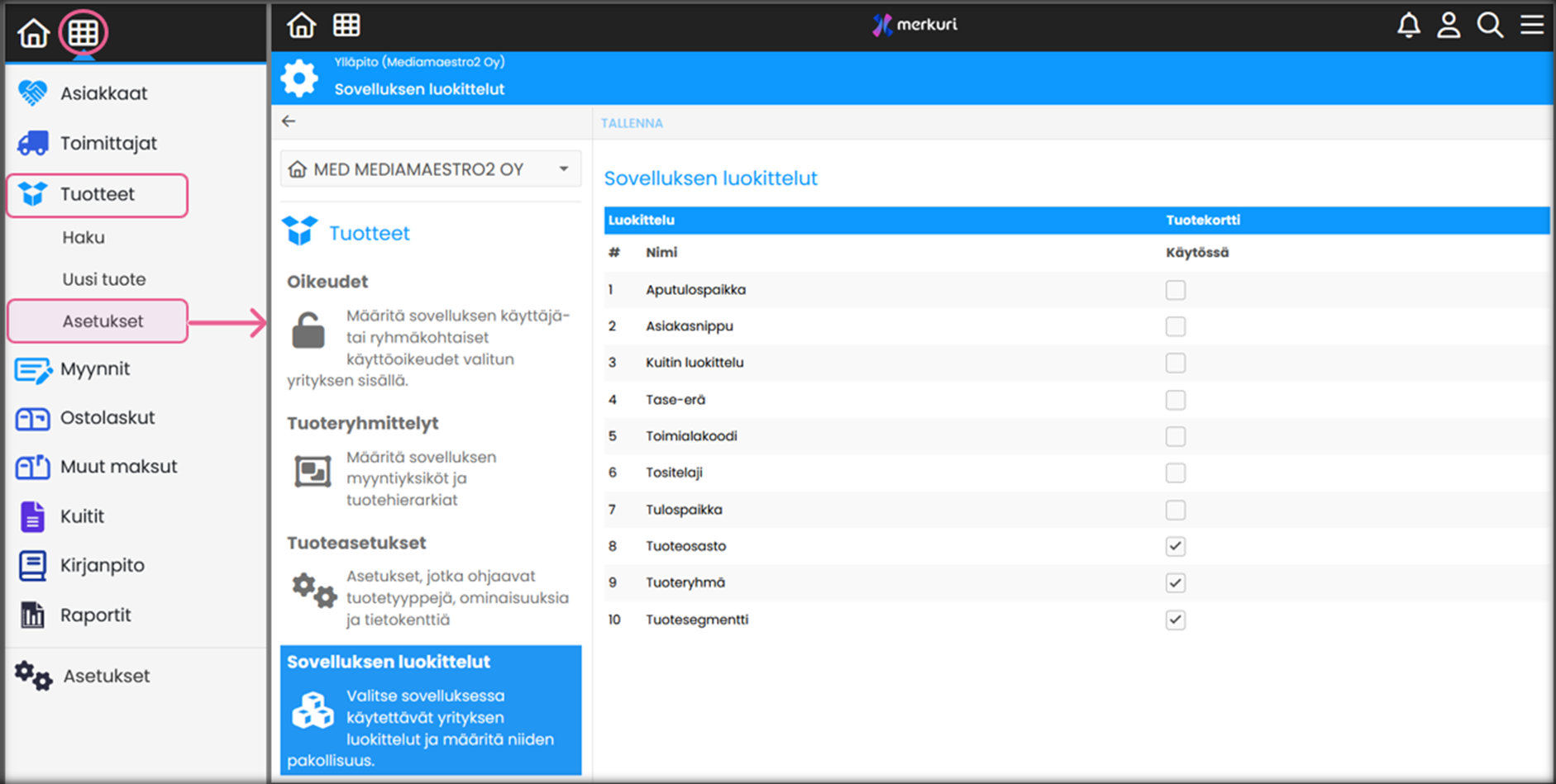 Tuotteet → Asetukset → Sovelluksen luokittelut