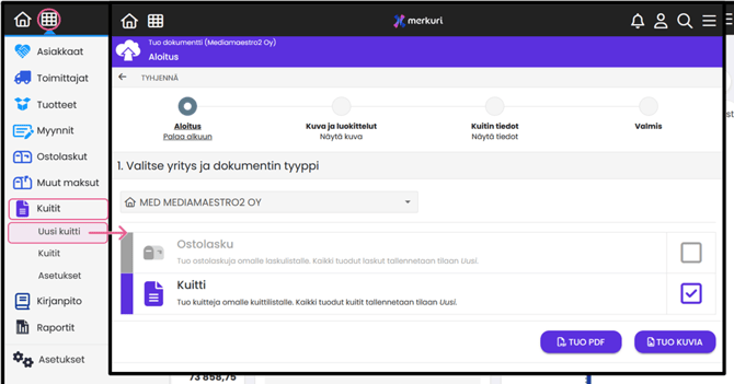 - TUO LISÄÄ: Aloita uuden kuitin tuonti
