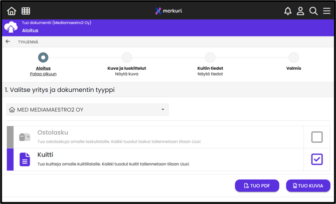 Yrityksen kuitit voidaan tuoda Merkuriin PDF-tiedostona tai kuvana, joko mobiililaitteella tai työasemalla.