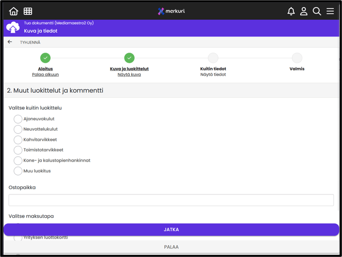 - Valitse kuitin luokittelu: esim. Ajoneuvokulut, Neuvottelukulut, Kahvitarvikkeet