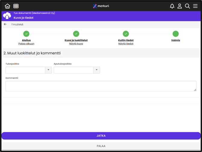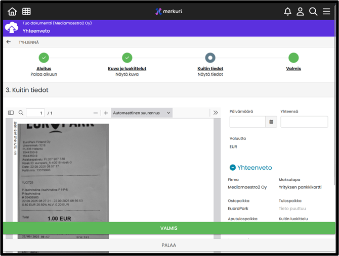 - Dokumentin tyyppi: Kuitti (tai Ostolasku, jos tuot ostolaskuja)