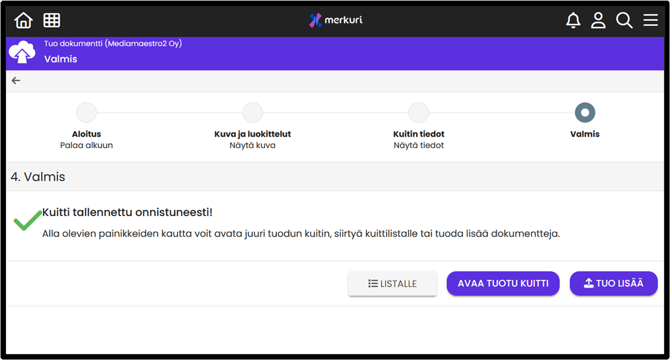 - Paina VALMIS → Kuitti tallentuu järjestelmään Uudet-tilaan