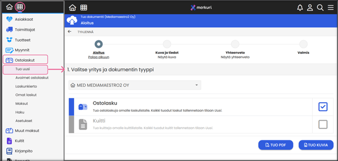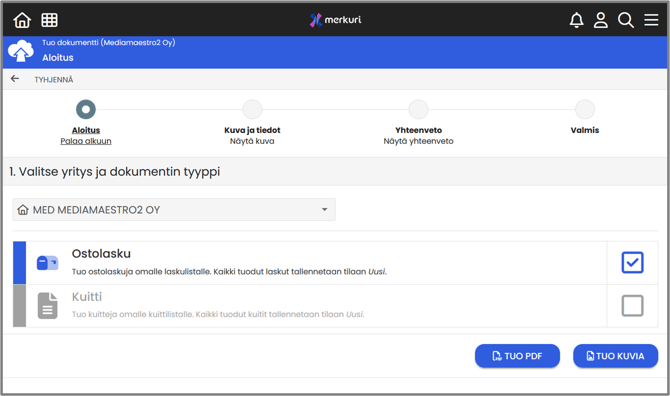1. Aloitus: Valitse dokumentin tyyppi: Ostolasku ja tiedostomuoto: PDF-tiedosto tai kuva.