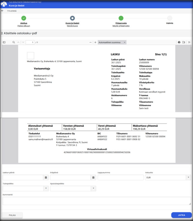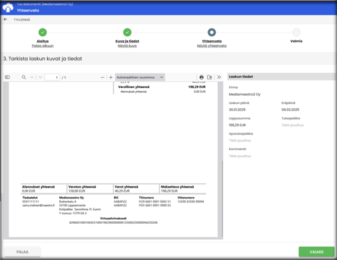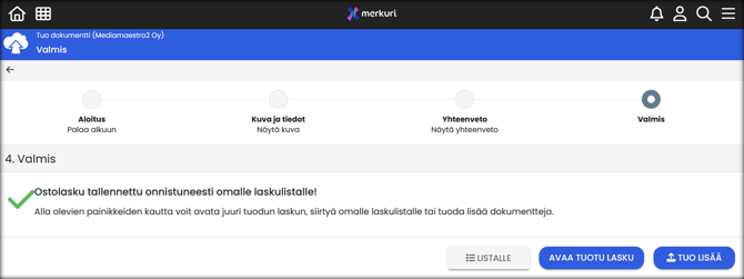 4. Valmis: Voit jatkaa laskun käsittelyä tai tuoda lisää laskuja.