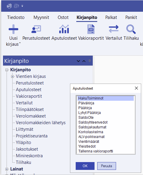 Tämän valinnan takaa löytyy tulosteita, joilla helpotetaan kirjanpidon selvitystyötä. Tällaisia ovat muun muassa hakutoiminnot, jolla saa haettua helposti selvitystilille menneet viennit. Lisäksi päivä- tai pääkirjoilla seurataan vaikkapa halutun päivän tai tilin tapahtumia. Aputulosteista löytyvät myös saldoyhteenvedot, tiedot vientimääristä sekä Alv-poikkeamaraportin. Aputulosteen voi ottaa siirtotiedostomuodossa, jonka voi sitten ladata vaikkapa tositteeksi vientien kirjauksessa.