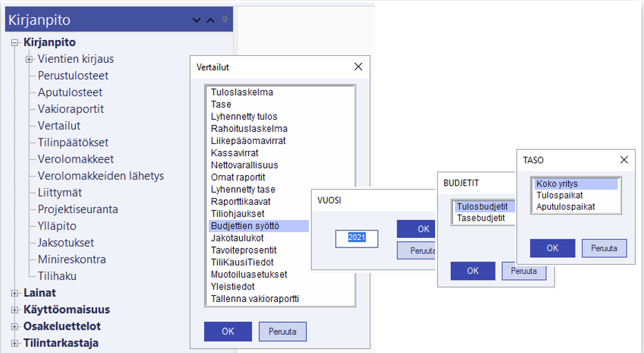 Valitse Kirjanpito/Vertailut/Budjettien syöttö/valitse vuosi.