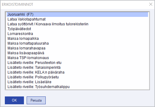 | Maksa lomarahavapaa | Jos lomareskontrassa on muutettu lomarahapäiviä lomarahavapaiksi tai muutos on tehty lomasäännössä, tällä valinnalla voit maksaa lomarahavapaat. Ohjelma kysyy lomarahavapaan alku- ja loppupäivän. Lomarahavapaan palkkalaji tulee olla määritelty poikkeuspalkkalajeihin (Tiedosto/Palkat/Yleistiedot/Poikkeus-palkkalajit). |