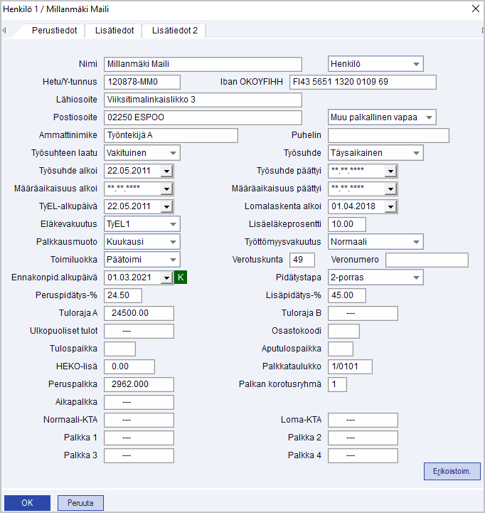 Palkansaajan kuukausipalkka, tuntipalkka ja aikapalkka. Taulukkopalkkaisilla henkilöillä Peruspalkka –kentässä näkyy taulukkopalkka palkkataulukosta + HEKO-palkka