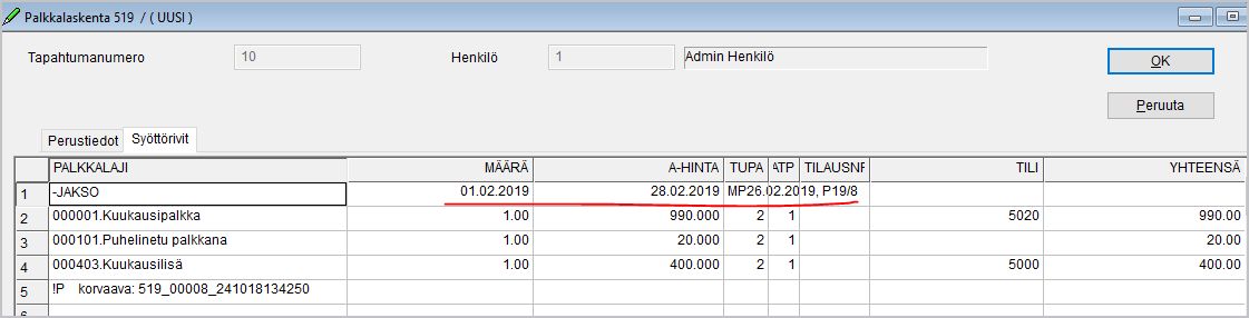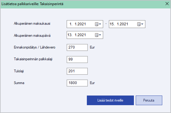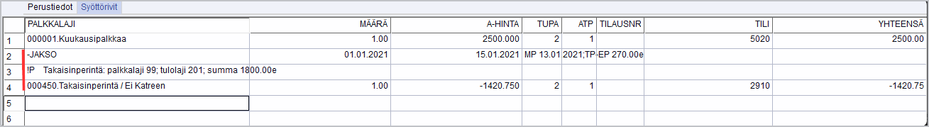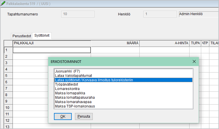 Kahden ylimmän rivin tietojen syötön voi tehdä helpoiten valitsemalla palkkariveillä F8 Erikoistoiminnot/Lisätieto riveille: Takaisinperintä.