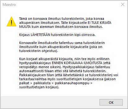 Jos valitset korvaavan ilmoituksen tulorekisteriin, se tehdään aina alkuperäisestä kirjauksesta. Korvaavaa ilmoitusta ei voi tehdä korvaavasta ilmoituksesta. Muista kuitenkin tehdä ennen tätä erillinen hyvityspalkkakirjaus, eli vastakirjaus alkuperäiselle korjattavalle kirjaukselle, joka tallentuu automaattisesti sellaiseen tilaan ettei sitä lähetetä tulorekisteriin.