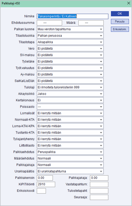 - palkansaajalta tällä kirjauksella perittävä nettosummainen rahamäärä, joka pidätetään työntekijältä yritykselle. Tätä tietoa ei lähetetä Tulorekisteriin (palkkalajin tulolaji on 999, eli sitä ei tule lähettää Tulorekisteriin). Tässä esimerkissä takaisinperittävä nettosumma kirjattiin palkkalajilla 450: