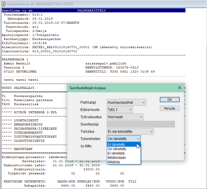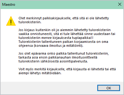 - Siirrä palkat uudelleen kirjanpitoon ja Tulorekisteriin. Ohjelmassa ei ole mahdollista muodostaa tulorekisteriaineistoa ilman kirjanpitoon siirtoa - poissulkienien mitätöinti. Tämä rajoitus on tehty sen vuoksi, että Tulorekisteriin ilmoittaminen ja kirjanpito vastaisivat toisiaan mahdollisimman hyvin. Tässä vaiheessa - ennen siirtoa/tulorekisteriaineiston muodostamista - voi tarpeen vaatiessa muuttaa yleistietoja tai henkilötietoja.