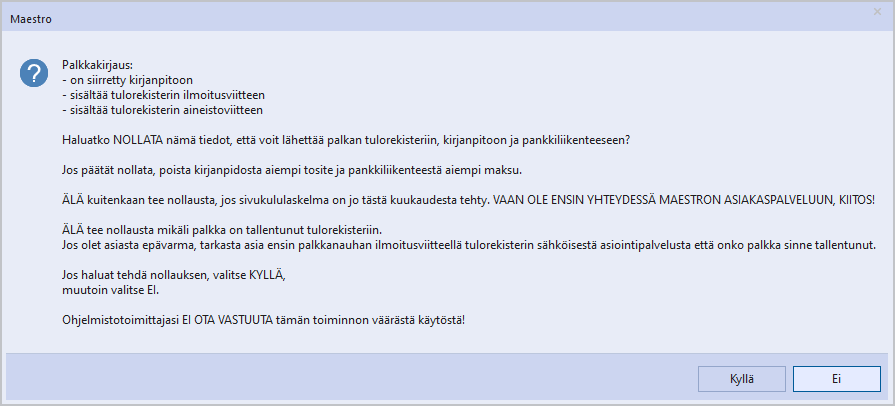Varmista ennen muutosta, että tältä kuukaudelta ei ole olemassa vielä sivukululaskelmaa. Jos sivukululaskelma on olemassa, älä tee nollausta ellet ole ensin ollut yhteydessä Maestron asiakaspalveluun. Joissakin tilanteissa palkasta voi muodostaa palkkatietoilmoituksen, ja sen voi lähettää Tulorekisteriin uudelleen vaikka sivukululaskelma on muodostettu.
