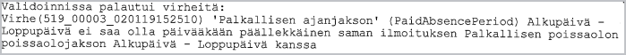 Edellä oleva ilmoitus saattaa johtua siitä, että jokin palkkalaji on merkitty turhaan poissaoloksi. Esimerkiksi lomaraha on merkitty palkkalajille poissaoloksi, vaikka poissaoloksi tulisi merkitä vain lomapalkka-palkkalaji. Nyt kun Tulorekisterin sanoma muodostuu ja tämän poissaolon yläpuolella ei ole jakso-riviä, palkkatietoilmoitukseen muodostuu tälle poissaololle poissaolojaksoksi palkkajakso. Jos samalla kirjauksella oli jokin toinenkin palkallinen poissaolo, helposti käy niin että samalle päivälle tulee kahta poissaoloa, ja tämä ei ole sallittua.