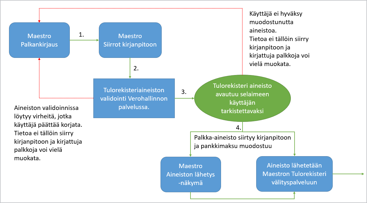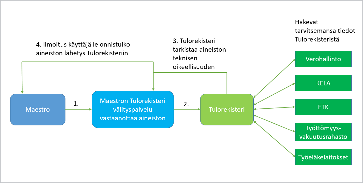 - Automaattisella lähetystavalla, jolloin ilmoitusten lähettäminen Tulorekisteriin tehdään palkkojen kirjanpidon siirtojen yhteydessä heti sen jälkeen, kun käyttäjä on hyväksynyt Maestron muodostaman ilmoitustiedoston.