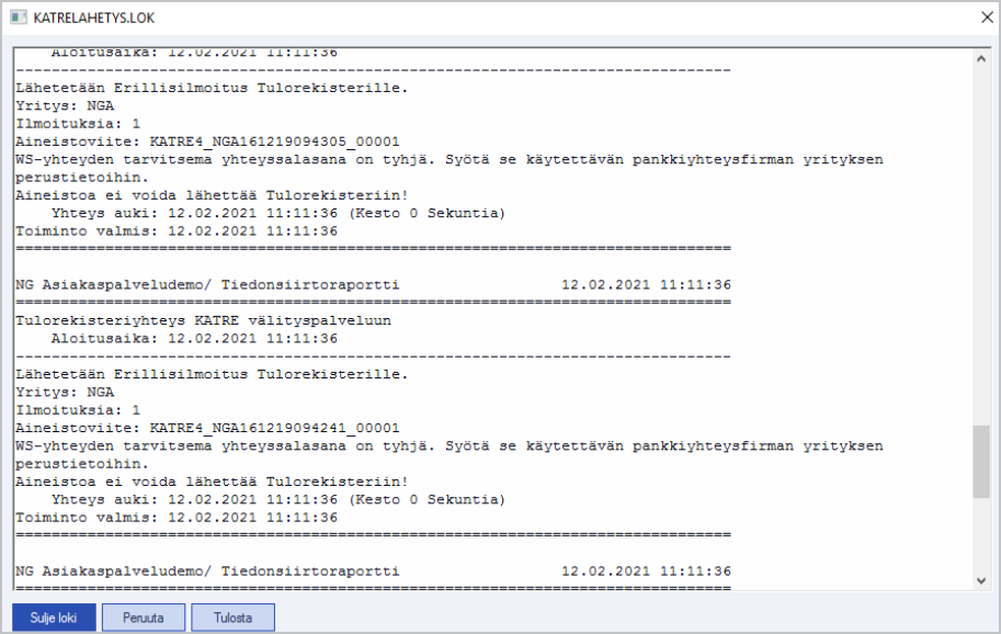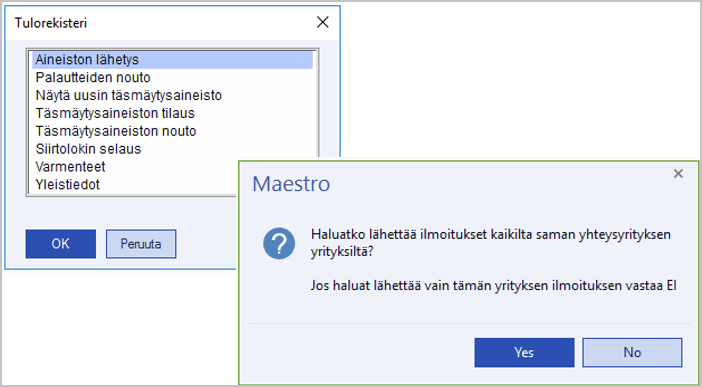Kun halutut aineistot on valittu mukaan lähetykseen, voidaan lähetys tehdä painamalla Lähetys -valintaa. Tämän jälkeen Maestro lähettää aineistot yksi kerrallaan Tulorekisteriin, ja ruudulla näkyy toiminnon edistyminen. Lähetyksen lopuksi ruudulle avautuu siirtoloki, josta nähdään siirron onnistuminen jokaisen aineiston osalta. Loki sulkeutuu valinnoilla Sulje loki- ja Peruuta. Lähetyksen lokin voi tulostaa valinnalla Tulosta.