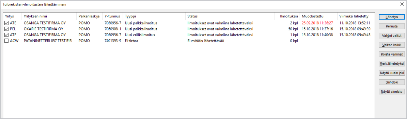 - Lähetys - Valittujen ilmoitusten lähetys Tulorekisteriin