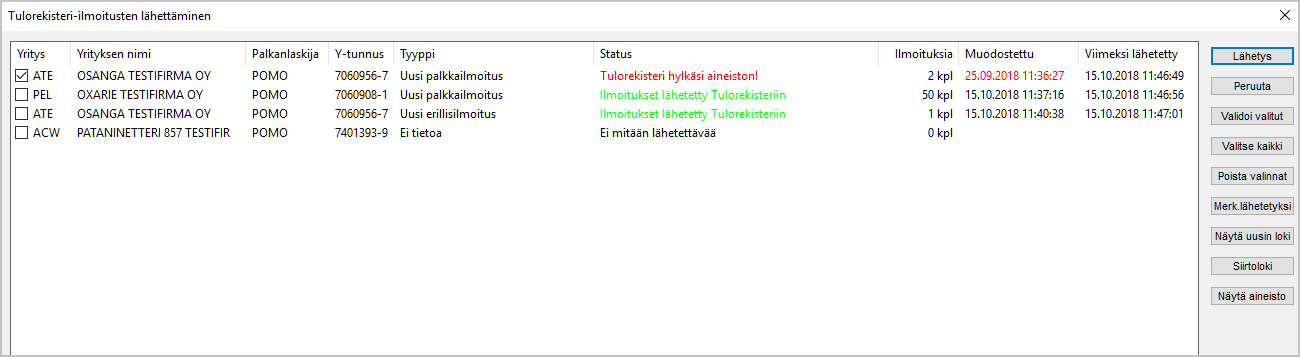 - ATE-yritykseltä listalla on myös uusi erillisilmoitus aineisto, joka sisältää yhden erillisilmoituksen ja listan lopussa näkyy, milloin viimeksi ATE-yrityksen erillisilmoitus on lähetetty onnistuneesti Tulorekisteriin.
