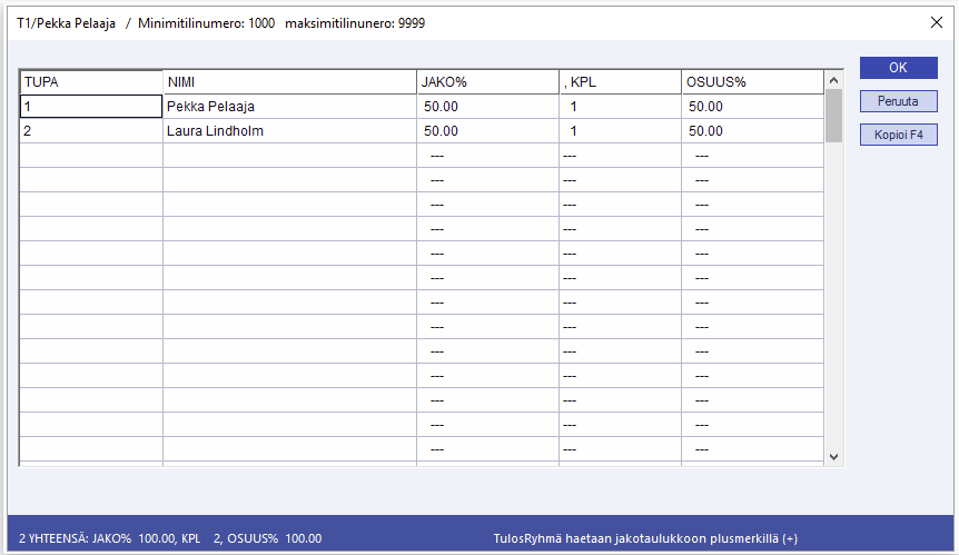 Syötä jakotaulukkoon kohdetulospaikat/-aputulospaikat ja jakoprosentit. Jakotaulukossa on tilaa 100:lle kohdepaikalle. Tulos-/aputulospaikan voi hakea taulukossa painamalla F10 tai nimen osalla. Olematonta tulos-/aputulospaikkaa voi määrittää. Painamalla tyhjässä TUPA -kentässä Enter pääsee syöttämään jako-osuus 0-paikalle.
