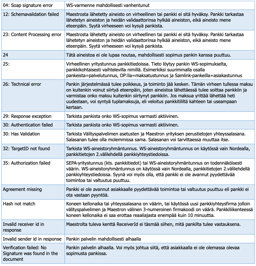 Yleisimpiä WebService yhteyden virheitäVirhe näkyy Tiedonsiirtoraportilla valinnalla Pankkiliikenne/Aputulosteet/Tiedonsiirtoraportit kohdassa WS-VIRHE. Virhe paluuviestissä. Virheet vaihtelevat hieman pankeittain.