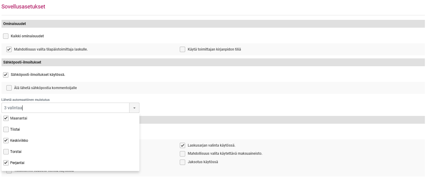 Sähköpostimuistuttamisen lähetyspäivät määritellään asetuksissa. Valitse Ostolaskut/Aseukset/Sovellusasetukset. Sähköposti-ilmoitukset -kohdassa on valinta Lähetä automaattinen muistutus. Valitse tästä ne viikonpäivät, jolloin haluat automaattimuistuttaa käyttäjiä ostolaskujen käsittelystä.