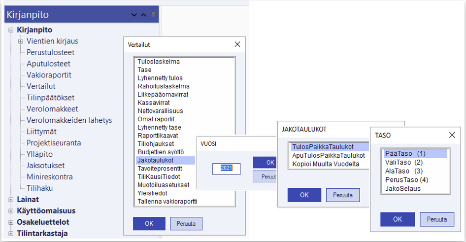Muodosta näillä valinnoilla uusi tulos- ja aputulospaikkojen jakotaulukko, tai päivitä olemassa olevaa jakotaulukkoa. Voit myös muodostaa linkkejä jo tehtyihin jakotaulukoihin. Tasovalinnalla määritellään, mille tasolle jakotaulukot halutaan. Tasolaskennat suoritetaan yksinkertaisesti - mikäli tasolle löytyy jakotaulukkoja