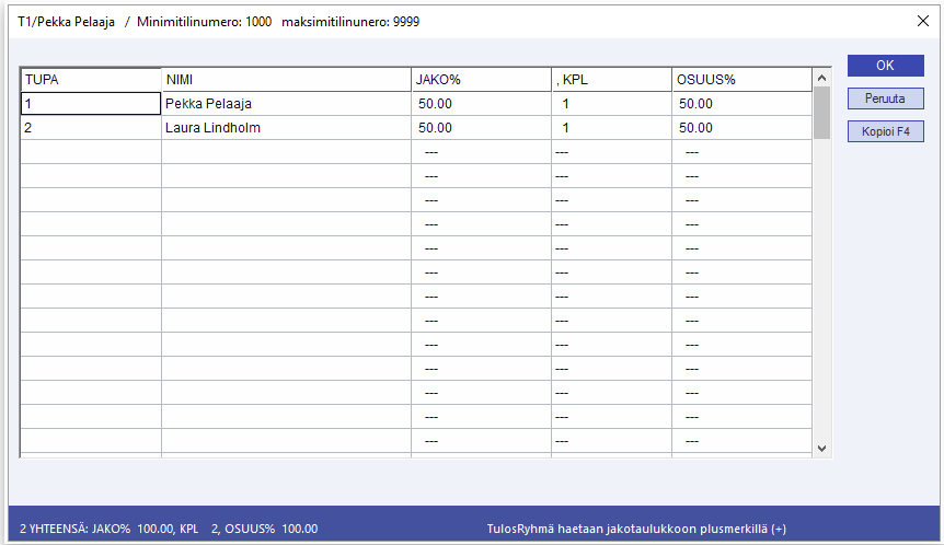 Kopioi jonkin muun tilikauden jakotaulukot pohjaksi sisäänmenotilikaudelle. Tee tarvittavat muutokset Tulos- tai Aputulospaikkataulukot -toiminnoilla. Voit kopioida jakotaulukon muultakin kuin edelliseltä tilikaudelta. Käytettäessä toimintoa Kopioi Muulta Vuodelta kopioituu prosentti vuoden joulukuun mukaisesti käsiteltävän vuoden jokaisen jakson prosentiksi. Tammikuulle syötetyn prosentin voi kopioida muille kuukausille painamalla F4.