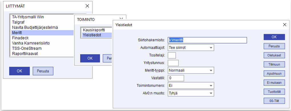 Valitse tästä ohjelma, johon siirrät kirjanpidon tai budjetin saldoja. Maestro nimeää ja taltioi siirtotiedostot automaattisesti siihen hakemistoon, joka on määritelty kyseisen liittymän Yleistietojen Siirtohakemisto-kenttään. Tämä valinta aukeaa jokaisen liittymävalinnan takaa, ja määritellään siis jokaiseen erikseen. Eri liittymissä on myös hiukan erilaiset yleistietomääritykset. Tässä esimerkkinä Meritt-liittymän valintaikkunan määritykset.